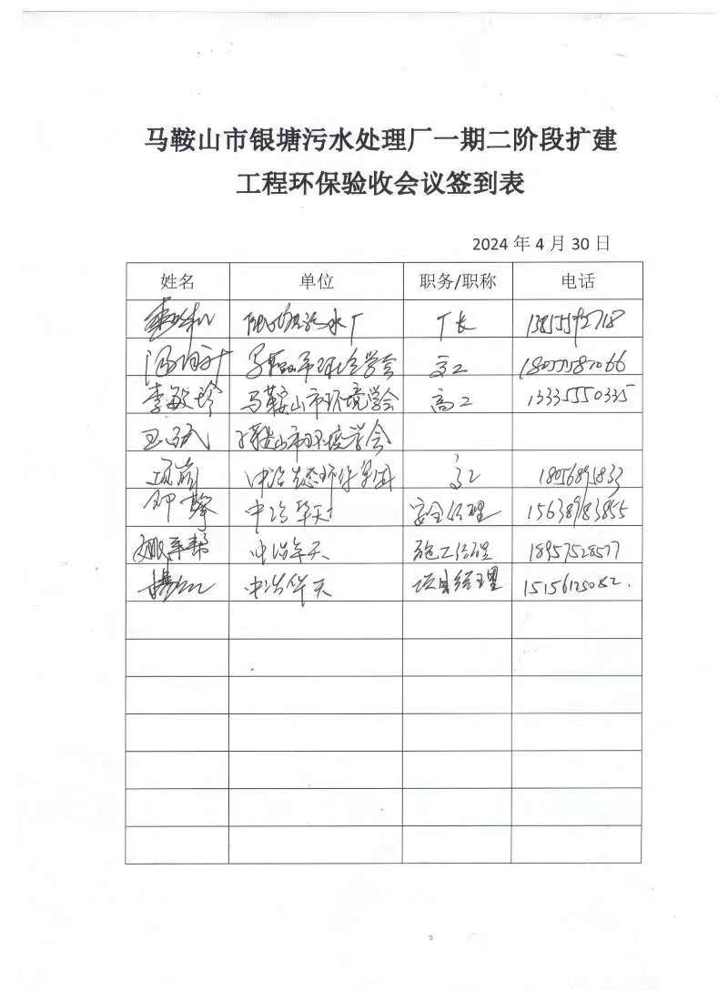 馬鞍山市銀塘污水處理廠一期二階段改擴(kuò)建工程項目根據(jù)《建設(shè)項目環(huán)境保護(hù)管理條例》、《建設(shè)項目竣工環(huán)境保護(hù)驗收暫行辦法》等相關(guān)規(guī)定于2024年4月30日組織召開竣工環(huán)境保護(hù)驗收會。會議按照相關(guān)要求由馬鞍山市中冶水務(wù)有限公司(建設(shè)單位)、中冶華天工程技術(shù)有限公司(施工單位)、安徽省貝斯泰檢測科技有限公司(編制單位)等單位的代表,會議邀請3名專家組成技術(shù)核查組,工作組通過現(xiàn)場勘查、詢問、討論等方式最終形成了驗收意見,意見認(rèn)為項目具備環(huán)境保護(hù)驗收條件,項目驗收合格。現(xiàn)將相關(guān)資料給予公開,公示期為2024年5月11日至2024年5月26日。公示期間公眾可通過電話或者郵件與我公司聯(lián)系。